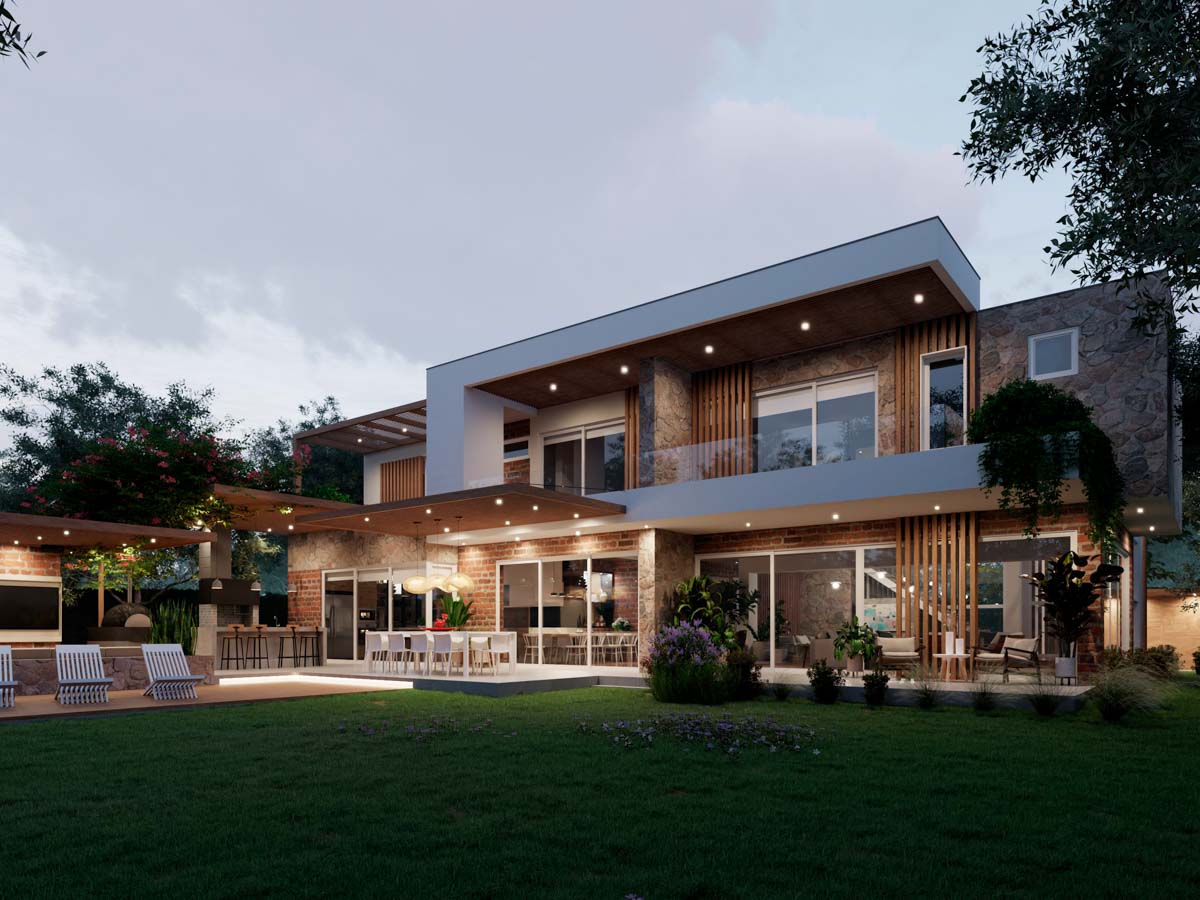 Esta casa de campo, una de nuestras favoritas, está ubicada en Cieneguilla en un terreno de 2,400m². Incorporamos materiales naturales como ladrillo rococho, piedra y madera, integrando el diseño con la naturaleza, característica distintiva de nuestro enfoque arquitectónico.